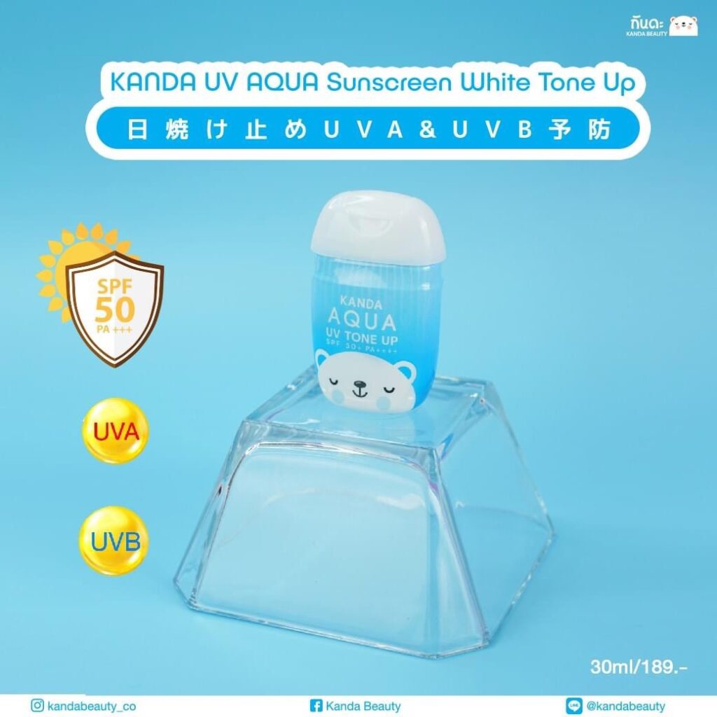 - กันแดดปัจจุบันควรมีค่า SPF 50 PA++++ ซึ่งเป็นค่าที่สามารถใช้วัดประสิทธิภาพในการป้องกันรังสี UVB ที่สามารถทำให้ทราบว่าเราสามารถอยู่กลางแสงแดดได้นานขนาดไหน โดยค่า SPF จะมีตั้งแต่ 30 ขึ้นไป จะสามารถป้องกันรังสี UVB ได้ ประมาณ 97% และค่า SPF ที่ 50 จะสามารถป้องกันได้ถึง 98% โดยที่ผิวของเราไม่ไหม้ ส่วนค่า PA คือ ค่าแสดงประสิทธิภาพในการป้องกันรังสี UVA ดังนั้นทางเราจึงแนะนำให้ค่า SPF 50 เป็นหลักและควรทาซ้ำทุกๆ 2 ชั่วโมง เราจึงขอแนะนำครีมกันแดดแบบผสมโทนอัพนั้น Kanda Auqa sunscreen white tone up กันแดด ครีม กันแดด ผิว หน้า โทนอัพ ปกป้อง แสงแดด หน้าขาว กระจ่างใส SPF 50/PA++++ 30ml ครีมกันแดดโทนอัพเนื้อสีขาว ที่นอกจากป้องกันได้ทั้งแสงแดด ฝุ่นมลภาวะ ด้วยค่า SPF 50 PA++++ ยังช่วยปรับโทนสีผิวให้ดูสว่างขึ้นเนื้อกันแดดโทนอัพ เกลี่ยง่าย ซึมลงสู่ผิวเร็ว สบายผิว ไม่หนืด ไม่เหนียว ไม่เป็นคราบ เน้นบำรุงและป้องกันแสงแดดในตัวเดียว คุมมันตลอดทั้งวัน ใช้ได้ทุกสภาพผิว